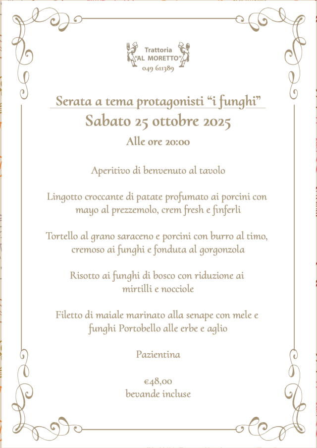 Nelle serate del Venerdì e Sabato accanto alle nostre specialità tradizionali come il baccalà alla vicentina, in insalata, mantecato, frittura mista di pesce, il nostro menu di carne ecc.. lo chef propone il menù paella ad euro 28 bevande incluse